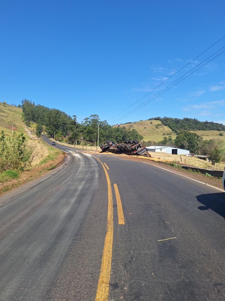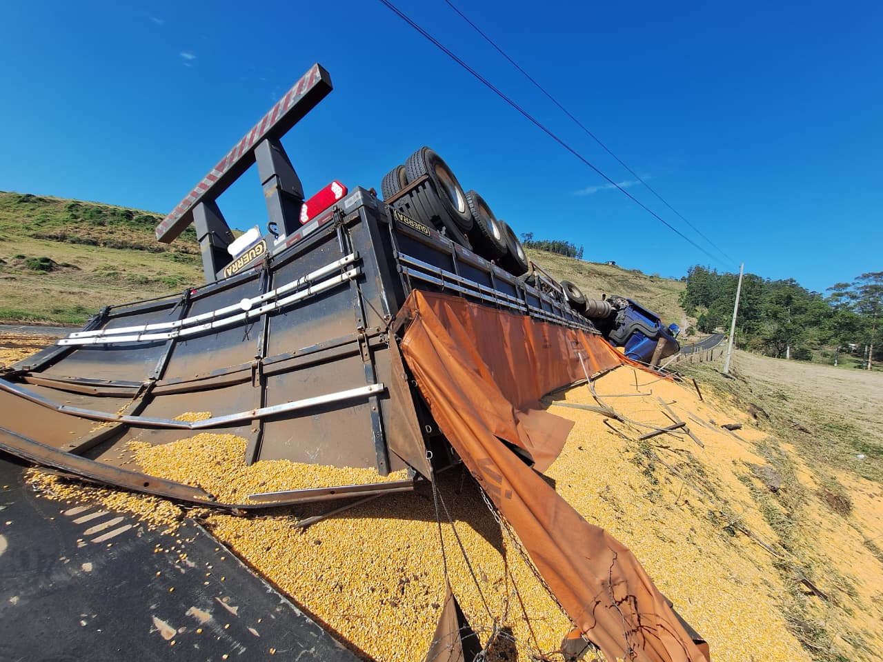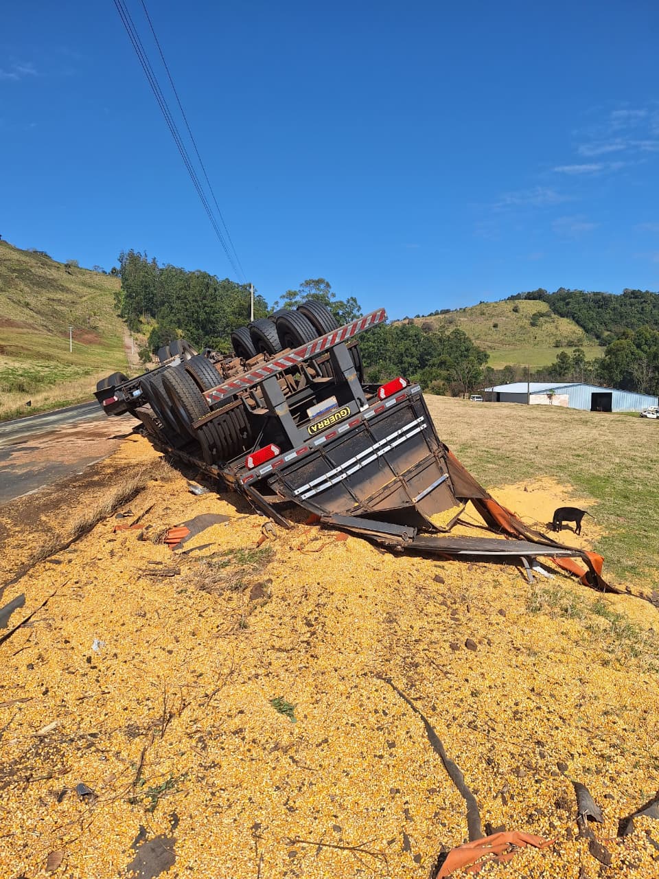 Um caminhão Scania G380 carregado com milho capotou na tarde desta sexta-feira (16) na SC-157, km 76,8, em Coronel Freitas. O motorista, um homem de 46 anos, sofreu lesões leves e foi atendido no local.