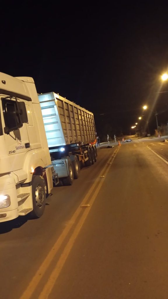 Conforme relato da guarnição, tratou-se de colisão transversal/frontal em cruzamento urbano. Indícios apontam que a motocicleta teria desrespeitado a sinalização de “pare”, acessando a rodovia e colidindo na lateral do semirreboque do caminhão-trator que trafegava pela via.